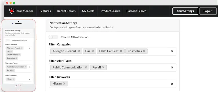 We know you are busy. In an effort to reduce your time fishing through alerts for ones that apply to you, you may choose to be sent only notifications for specific product types. You may even choose to be only sent products containing a certain keyword (for example, “peanuts” or “dairy”). Save yourself from alert fatigue and allow Recall Monitor to pick out relevant recall alerts for you and your family.