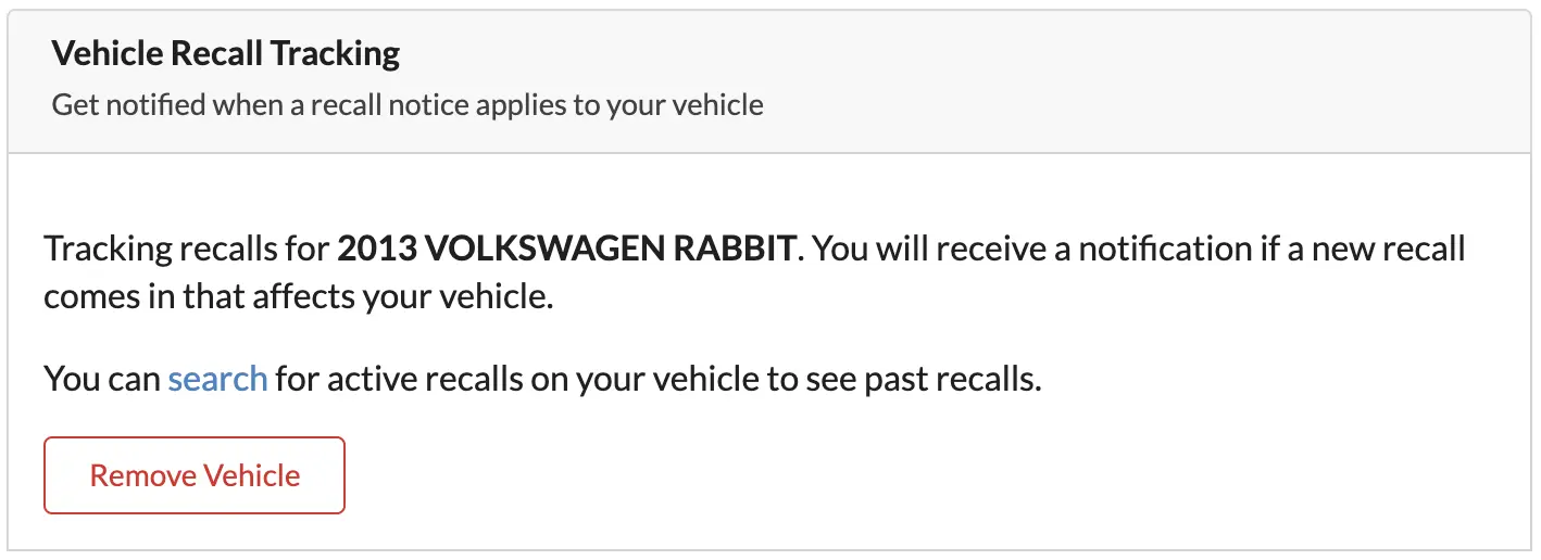 Sign UpTrack past and future recalls on your vehicle and get notified as soon as a recall affecting your own vehicle comes in.
